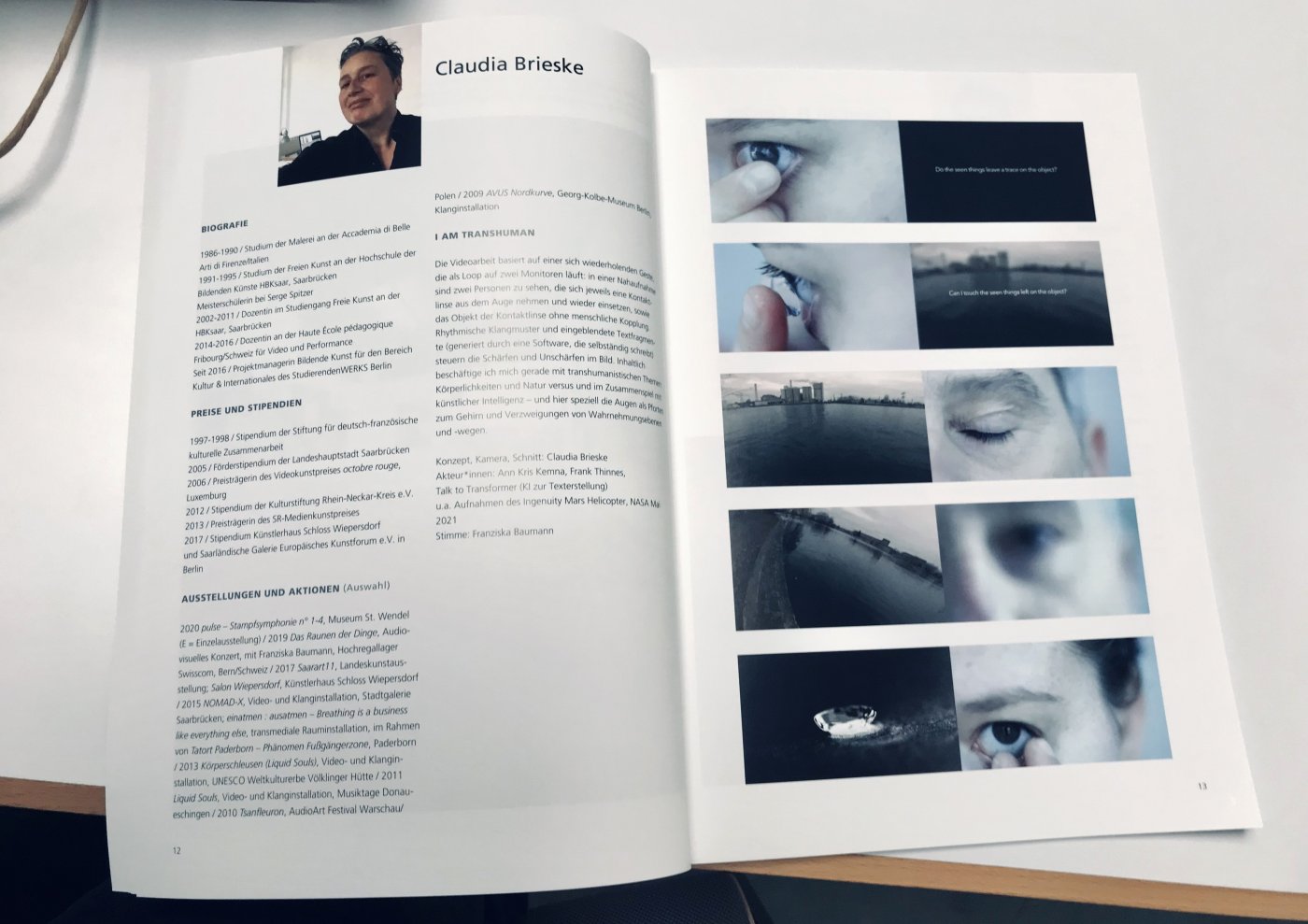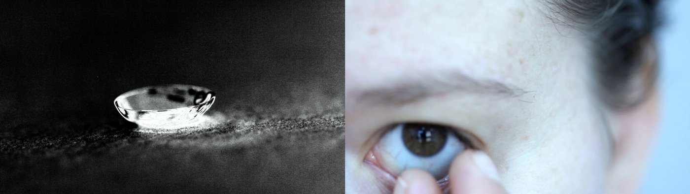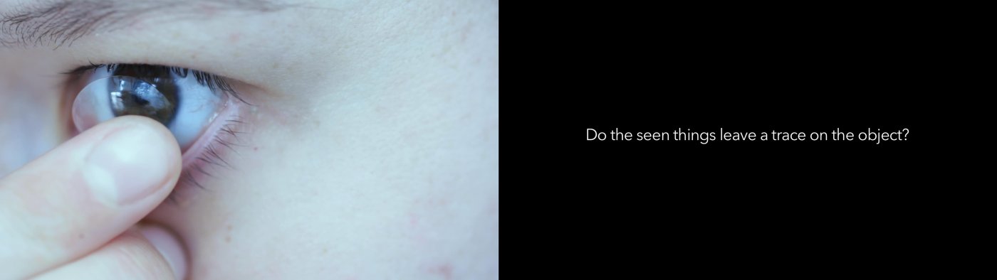 The video work is based on a repetitive gesture that loops on two monitors: a close-up shows two persons each taking a contact lens out of their eye and putting it back in, as well as the object of the contact lens without human interaction. Rhythmic sound patterns and overlaid text fragments (generated by software that writes on its own) control the focus and blur in the image.