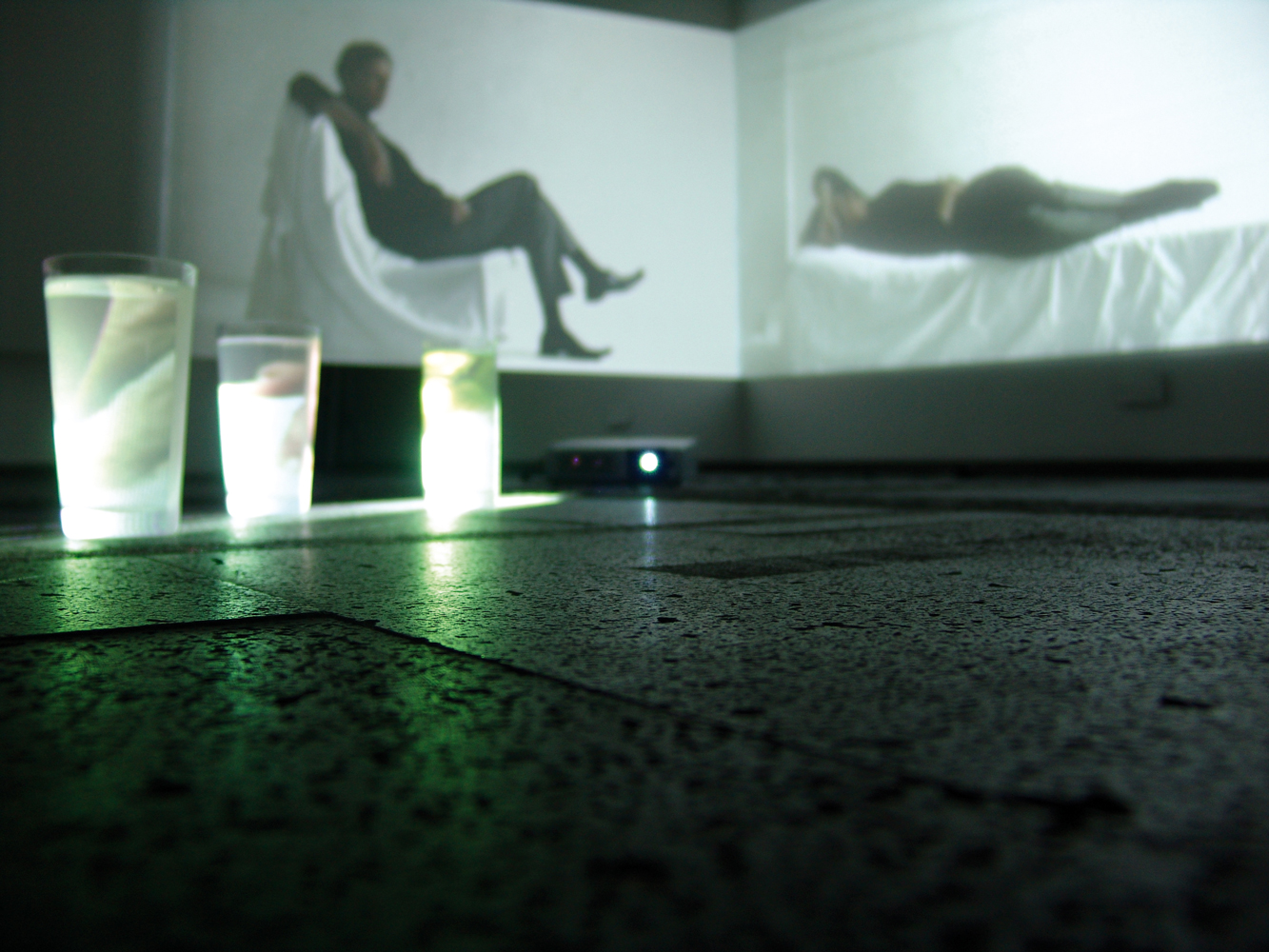 Most of the room’s glass walls are covered. Intimacy is visible through a window. However, the viewers are not allowed to enter the situation. Parts of the situation are projected on a glass object at the front that reminds of a magnifying glass. The details shown are synonyms for pictures taken from dreams and reality; they serve as a link to the communication situation in the room and to the inner world of the protagonists. At the back of the room two projections next to each other show that the patient and the psychoanalyst are actually facing away from each other.